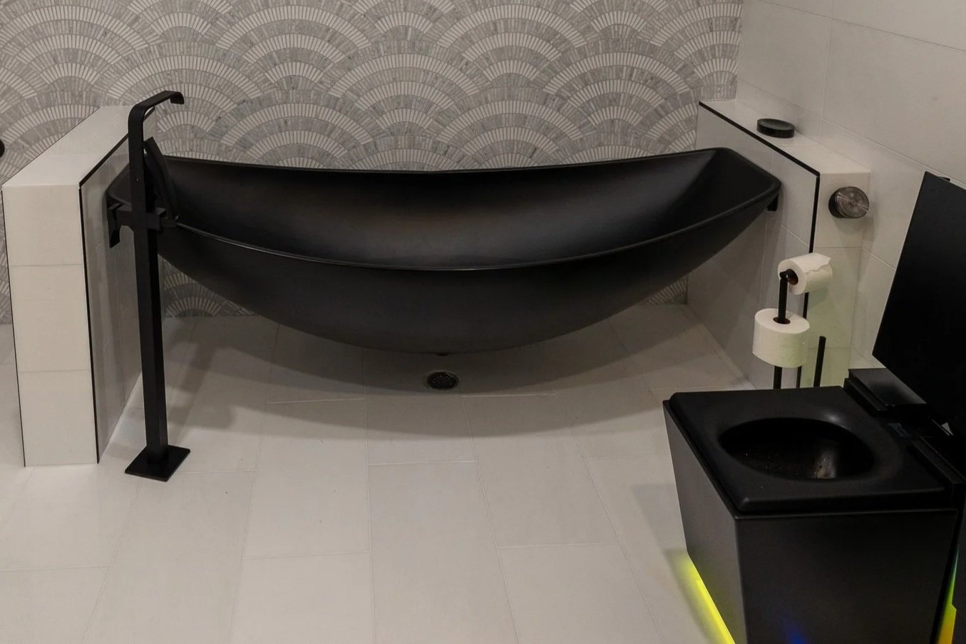 The Numi intelligent toilet is a remarkable piece of technology, combining comfort features with elegant design. However, the true centerpiece of the space is undoubtedly the Hammock Tub.